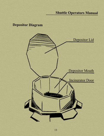 The other benefit of guiding the player around the dense book was that room is left for world building. Little notes like copyrights, terms of service, years, references to previous manual editions, and space to further establish the tone of the evil corporation authoring the manual (which enslaves the player) and to establish bits of tone for previous Shuttle Operators by their notes interspersed throughout the manual contents. This is extra space would help me illustrate history while maintaining a similar tone to what the original terminal manuals once offered that felt cohesive and logical within the game world.