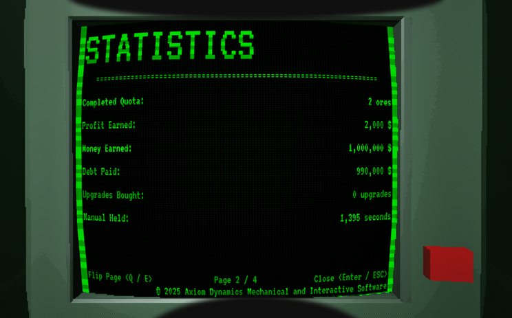 One note as well as that you may notice is the Purple light listed here, which does not appear in the final game. Gas Leaks never were an actual mechanic in the game, but what I knew as a designer and a writer was that if we told the player it was a thing, the player would assume it to be true. Many early versions of the manual featured the Purple Light in the manual, which both artificially added stress to the player as players would assume there was even more to watch for than there really was, and the inclusion of notes like this which were not accurate to things actually in the game (of which this wasn't the only one), were part of a cut narrative idea, where the manual given to the player was meant for a slightly different model of Mining Shuttle than what the player was using, further reinforcing how little care the company the player was enslaved by cared for them.